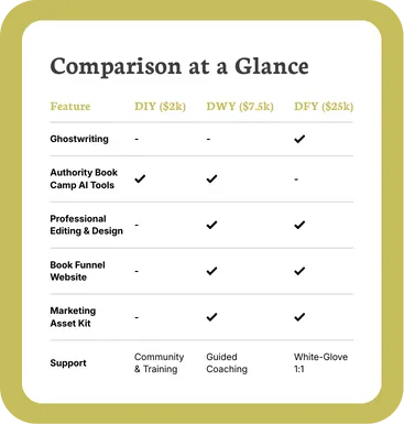 You get full access to our Authority Book Camp platform and AI tools, plus our complete library of training videos, templates, and checklists. You'll know exactly how to write, publish, and market your book the right way.